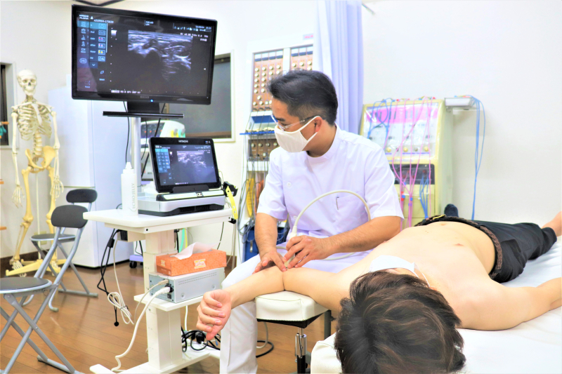 ・場合によって、超音波(エコー)を用いての手技や正しく関節を動かせるよう、上手に筋肉を使えるよう誘導しながらの運動療法や自動介助運動を行います。