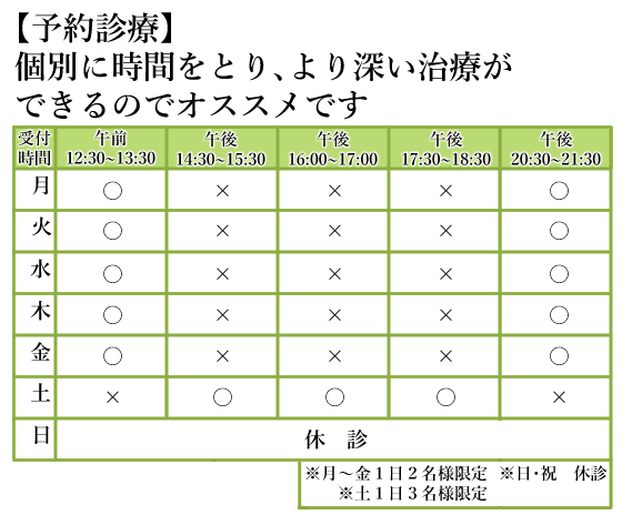 【予約診療】個別に時間をとり、より深い治療ができるのでオススメです