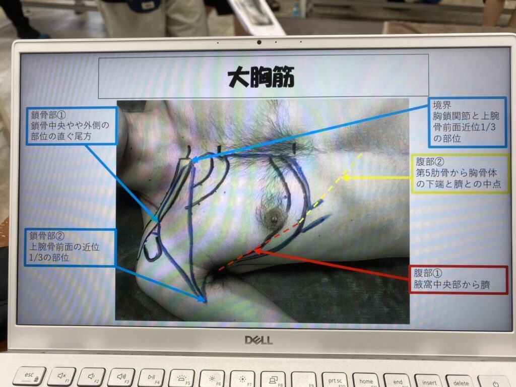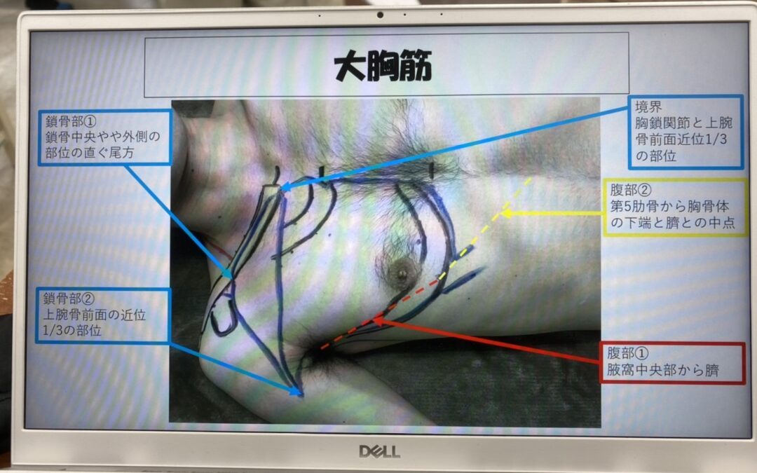 触察とは、骨、筋肉、靭帯といった組織を体の表面から触ってマジックで書いて表から身体の中が見えるように学ぶ講座です。